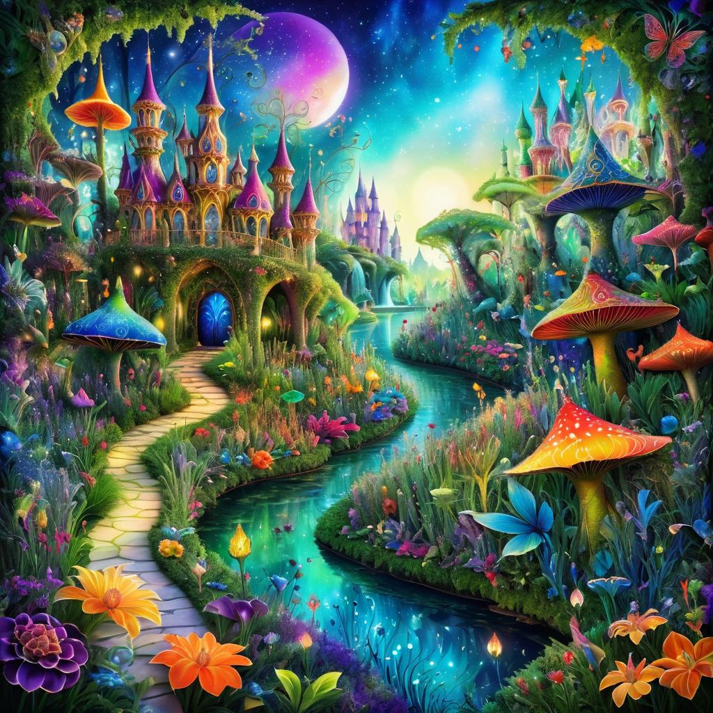Fantasy painting of an enchanted garden filled with fantastical creatures, with intricate detail and vivid colors.