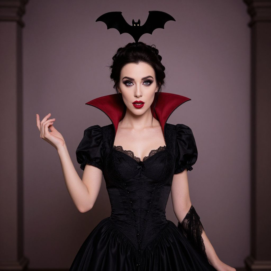 "Vampirina Countess Dress, woman in a black dress with a bat on her head"