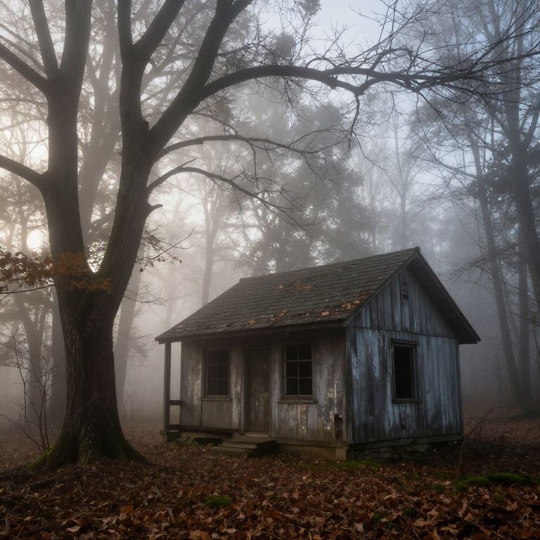 Abandoned forest cabin surrounded by dense mist, old wooden structure with peeling paint, fallen leaves covering ground, twisted trees bending towards sky, soft morning light filtering through fog, peaceful yet haunting atmosphere.
