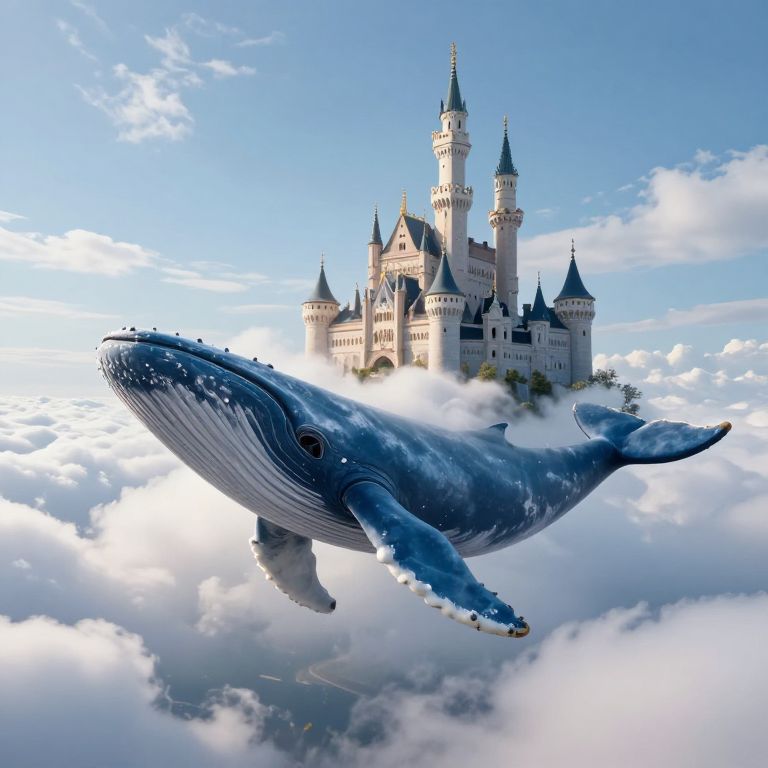 Photorealistic digital artwork of a massive blue whale soaring above a whimsical, fairy-tale castle surrounded by fluffy clouds. Bright blue sky in the