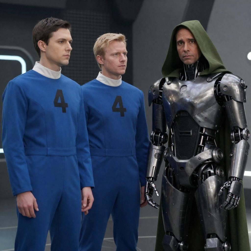 Three men in a futuristic sci-fi setting; two wear blue bodysuits with white collars and black number 4 on the chest, one has dark hair and the other blond. A robotic man clad in metallic armor and a green hooded cloak stands next to them. The background features dark, illuminated grid-like patterns, enhancing the high-tech atmosphere.