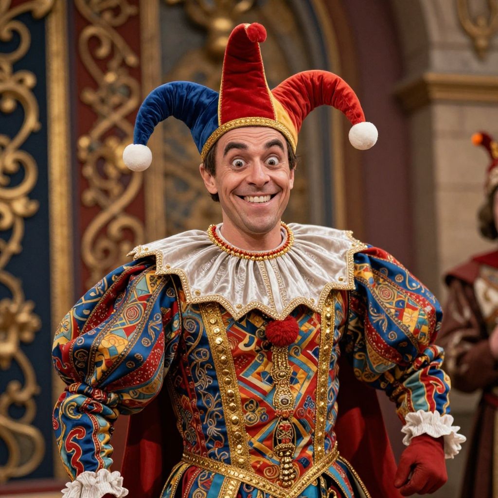 Photograph of a man in an elaborate jester costume, featuring a red and blue jester hat with white pom-poms, a white ruffled collar, and a colorful, intricately patterned tunic with gold trim. He has a wide, playful smile and is standing in front of an ornate, baroque-style backdrop with gold detailing and arched windows. His outfit includes red gloves, and his expression is joyful and mischievous. The image has a vibrant, festive feel, with rich colors and elaborate costume details.
