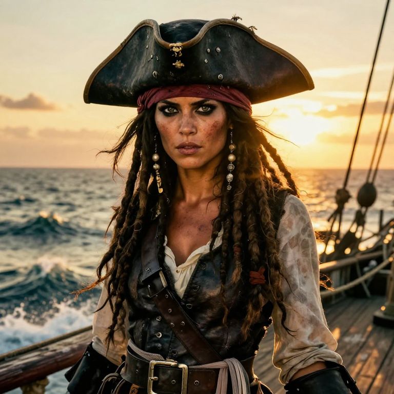 A bold and fierce female pirate with long, flowing dreadlocks that cascade down her back, her skin toned and weathered from years at sea. She wears a classic pirate hat with a wide brim and a feather, slightly tilted to one side, adding to her daring and mysterious charm. Her eyes are sharp and expressive, reflecting both cunning and confidence. She stands on a weathered wooden deck at sunset, the golden hour casting warm light over the ocean, with waves gently crashing in the background. The scene is vibrant, detailed, and full of a adventurous, timeless atmosphere.