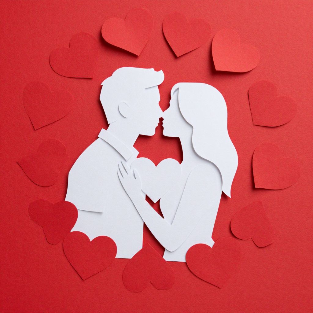 A paper cut art design of a man kissing a woman in a white heart, surrounded by a red heart pattern, symbolizing Valentine's Day.