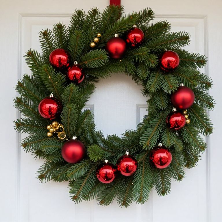 Vibrant red Christmas ornaments gleam amidst lush green pine branches, forming a festive wreath adorned with gold accents, gracefully hanging on a white door.