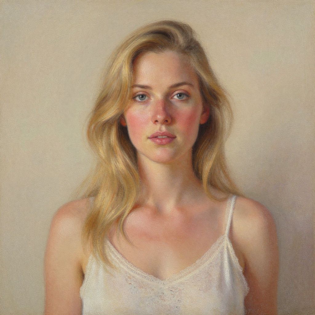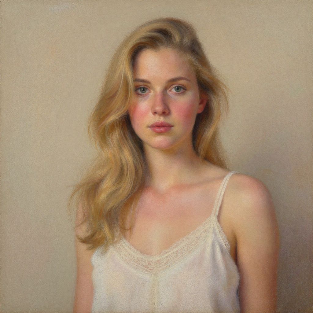 Pastel painting captures a serene portrait of a woman with golden blonde hair cascading over her shoulders, wearing a delicate white tank top, set against a soft, textured background with subtle earthy tones.