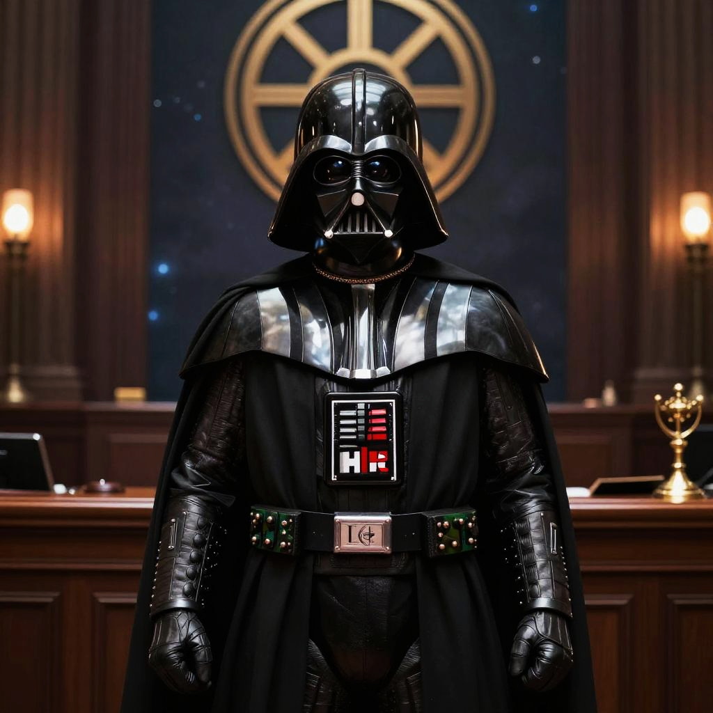Photograph of Darth Vader, a character from the Star Wars franchise, standing in a dimly lit courtroom. He wears his iconic black, shiny armor with a helmet that has a dark visor, and a black cape. His chest plate features a glowing red and black square with a central light. The background shows a dark blue wall with a golden circular emblem, flanked by two warm, glowing lamps. The courtroom has wooden furniture with a desk and a small, ornate trophy on the right. The overall atmosphere is ominous and formal.