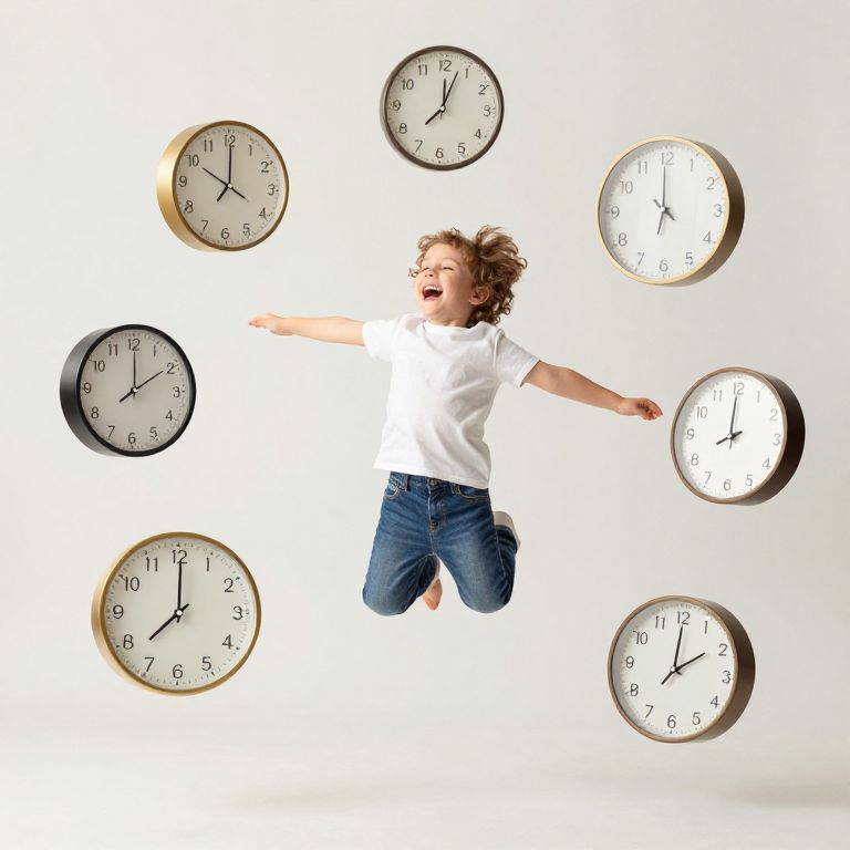 Joyful toddler leaps mid-air, surrounded by ten floating clocks of varying sizes and orientations, creating a whimsical scene of suspended motion against a neutral backdrop.