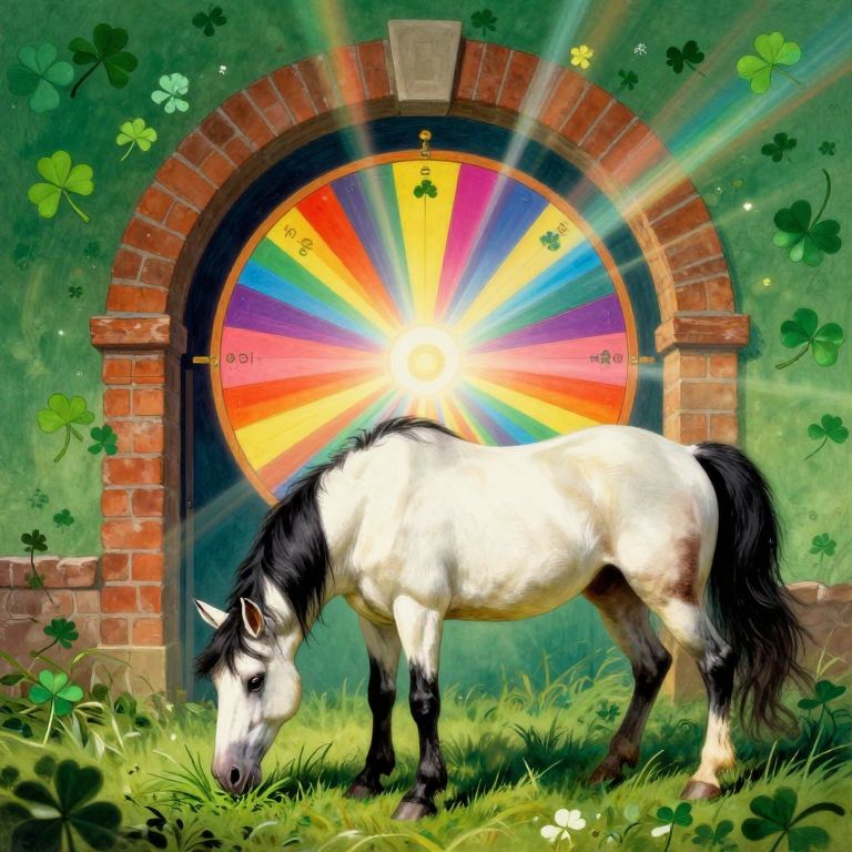 Photograph-like CGI image of a white horse with a black mane and tail standing in front of a colorful, radial sunburst background, resembling a wheel of fortune. The horse grazes on green grass with scattered white and yellow flowers. The background features a green, clover-patterned wall with a red brick archway framing the sunburst. Radiant beams of light emanate from the center of the sunburst, adding a magical, ethereal quality. The horse's coat is smooth and shiny, contrasting with the textured bricks and lush grass. The overall style is vibrant and whimsical.