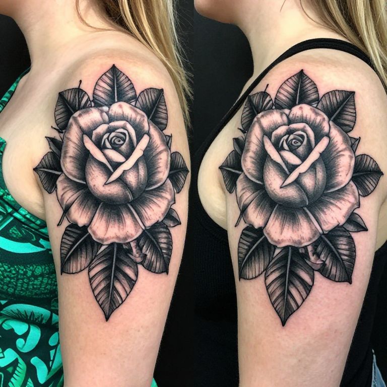 Photograph of a woman's tattooed upper arm and side, featuring a large, detailed black and gray rose with leaves, wearing a black strap top