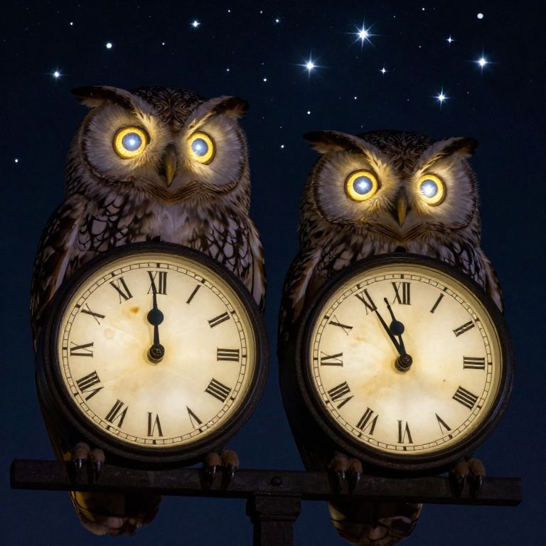 Digital illustration of two owls with glowing yellow eyes, perched on a branch, each with a glowing clock face showing different times, against a dark