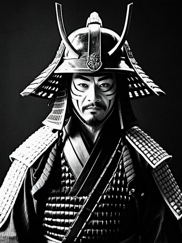 Black and white portrait of a man wearing a traditional Japanese samurai helmet and armor. The costume includes an ornate helmet with side protectors and detailed body armor plates. The subject has strong facial features accentuated by warrior-style face paint and a beard.