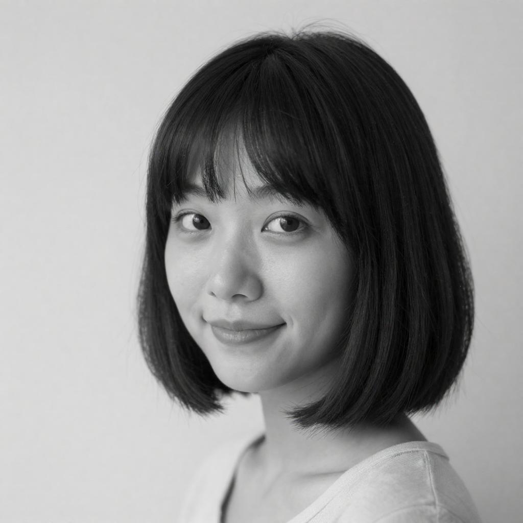 Black and white photograph of a young woman with straight, medium-length hair and bangs, gazing slightly to the left. Blurred vertical bars in the background. Neutral facial expression. Head and shoulders portrait. Monochrome tones.