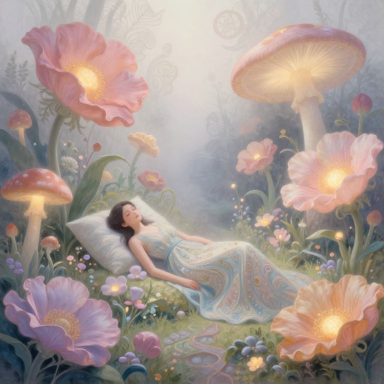 Dreamy digital painting of a woman with dark hair, sleeping in a colorful, patterned dress, surrounded by glowing mushrooms and flowers in a magical forest