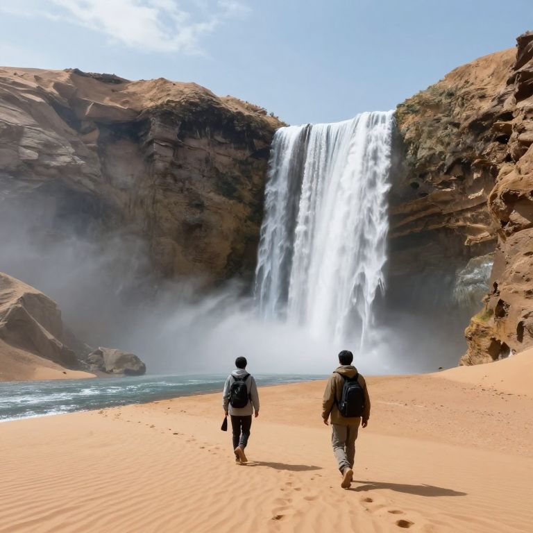 Photograph of two people, one wearing a gray hooded jacket and black pants, the other in a dark jacket and gray pants, walking away from a large waterfall in a desert landscape. The waterfall, with white cascading water, is surrounded by tall, rocky cliffs on either side. Mist rises from the base of the waterfall, blending with the sandy, ripples-textured desert floor in the foreground. The sky above is bright blue with scattered clouds. The scene combines natural beauty with contrasting elements of water and sand.