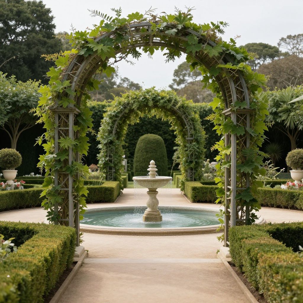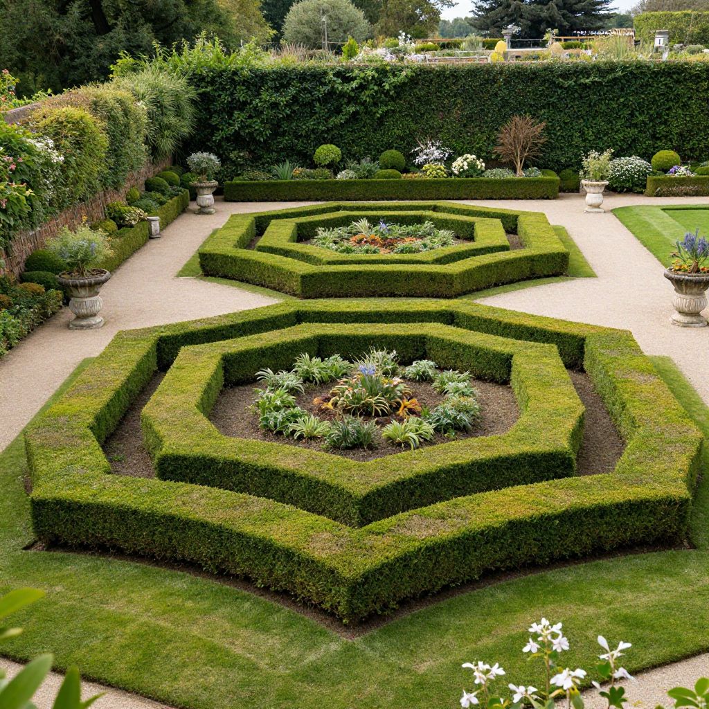 A meticulously manicured garden invites contemplation and serenity, where geometric precision and natural beauty converge, evoking a sense of timeless elegance and quiet celebration.
