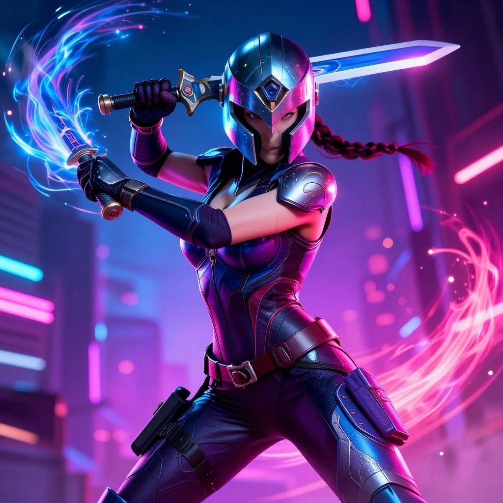 Digital art of a female warrior in futuristic armor, wielding a glowing sword with blue and pink energy swirls, in a neon-lit cityscape.