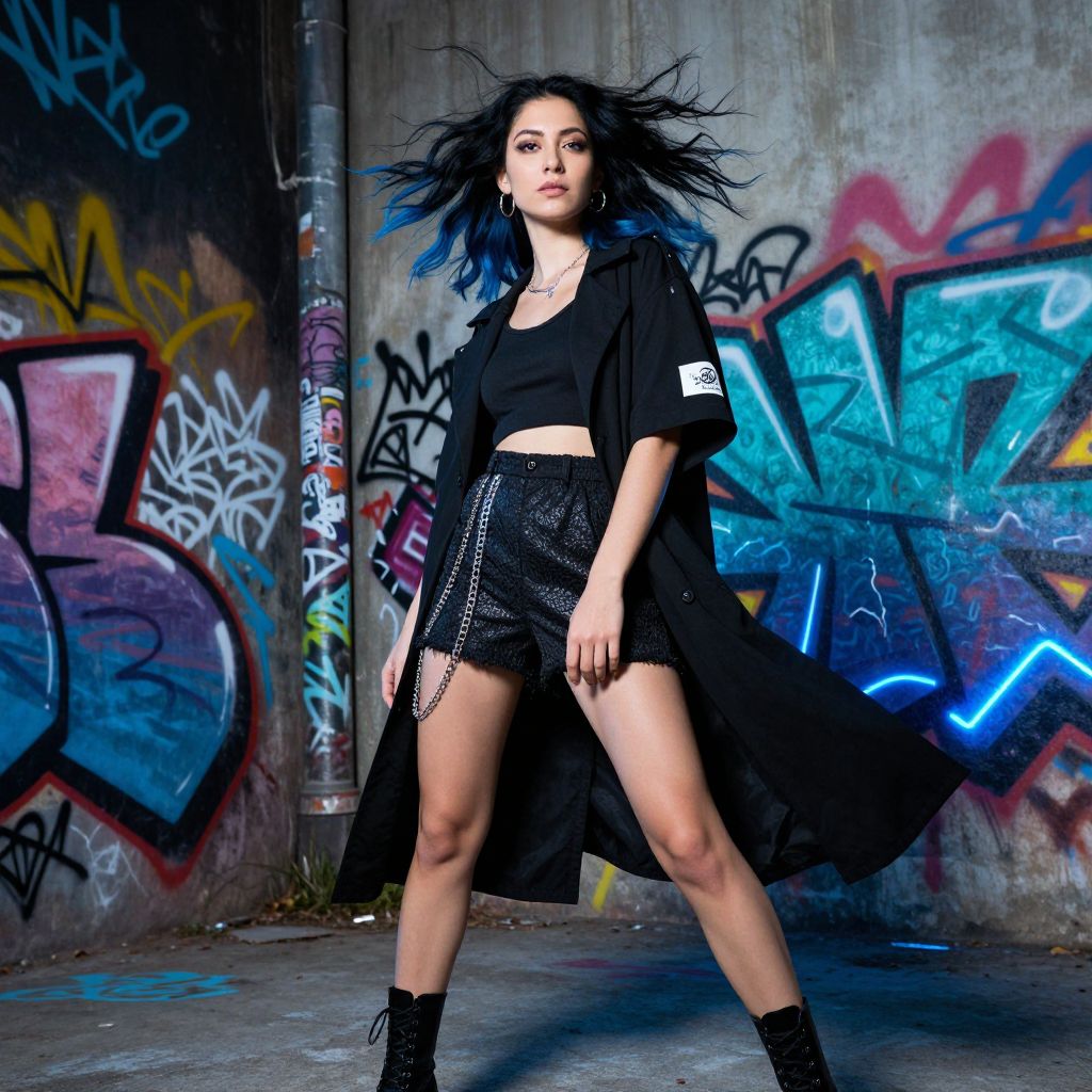 Photograph of a young woman with pale skin and dark blue-dyed hair standing in a graffiti-covered urban alley. She wears a black crop top, high-waisted black sequin shorts, and a long black coat that flutters in the wind. Her black ankle boots have a rugged texture. The background features colorful graffiti with blue, pink, and purple tags on a concrete wall. A metal pipe is on the left, adding to the gritty atmosphere. The woman's confident stance and intense gaze dominate the image, with dramatic lighting highlighting her figure against the vibrant graffiti.