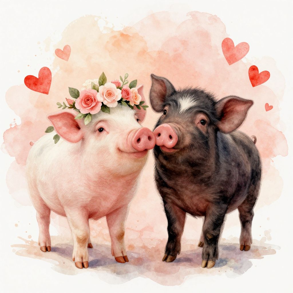 The image depicts a charming watercolor painting of two piglets, evoking a sense of warmth and affection. The piglet on the left is adorned with a delicate floral crown, featuring pink roses and green leaves, adding a touch of elegance to its appearance. The piglet on the right, with a slightly darker coat, stands close to the first, their noses almost touching, creating an intimate and endearing moment. The background is a soft blend of warm hues, with splashes of watercolor creating a textured, almost abstract effect. Red hearts are scattered throughout the image, enhancing the romantic and affectionate atmosphere. The overall composition is balanced, with the piglets centrally positioned, drawing the viewer's attention to their tender interaction. The use of watercolor techniques adds a dreamy, ethereal quality to the scene, making it feel both whimsical and heartwarming.