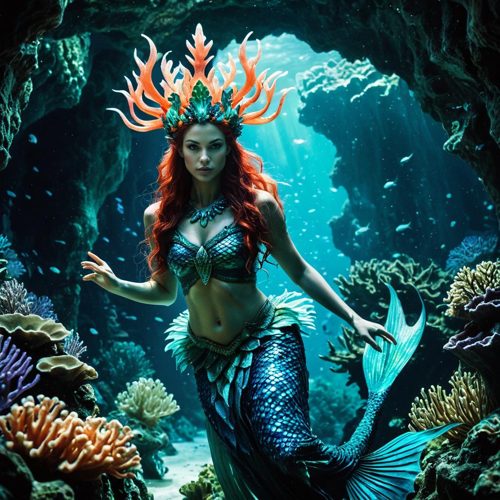 Fantasy character art of a female Merfolk enchantress, with iridescent scales, coral crown. Depicted in an agile pose with underwater cave with bioluminescent flora, emphasizing stealth and dynamic motion.
