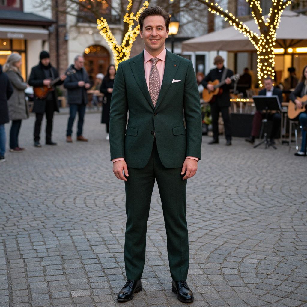 A man, dark green suit, blush pink shirt, patterned tie, black derby shoes, charming cobblestone square, local musicians, twinkling lights, cinecolor, confident smile. Man has masculine face and piercing eyes