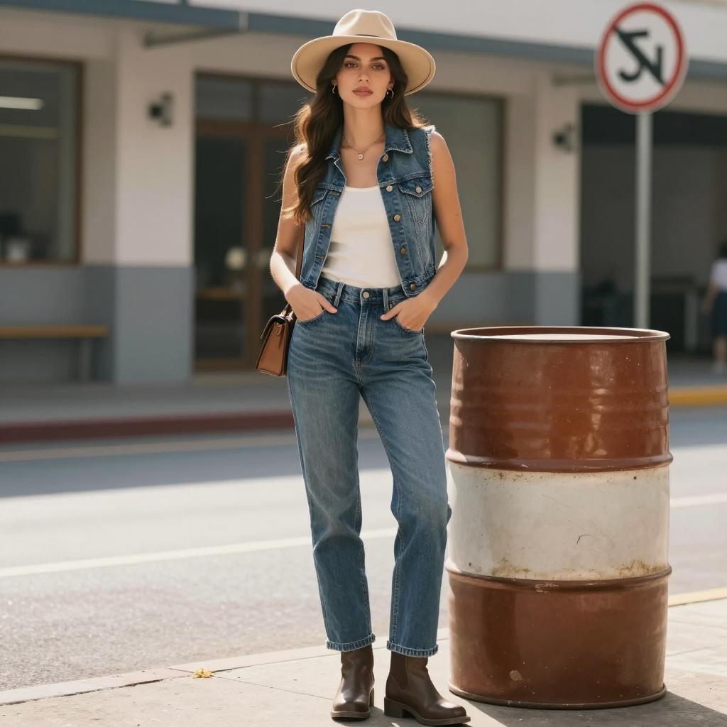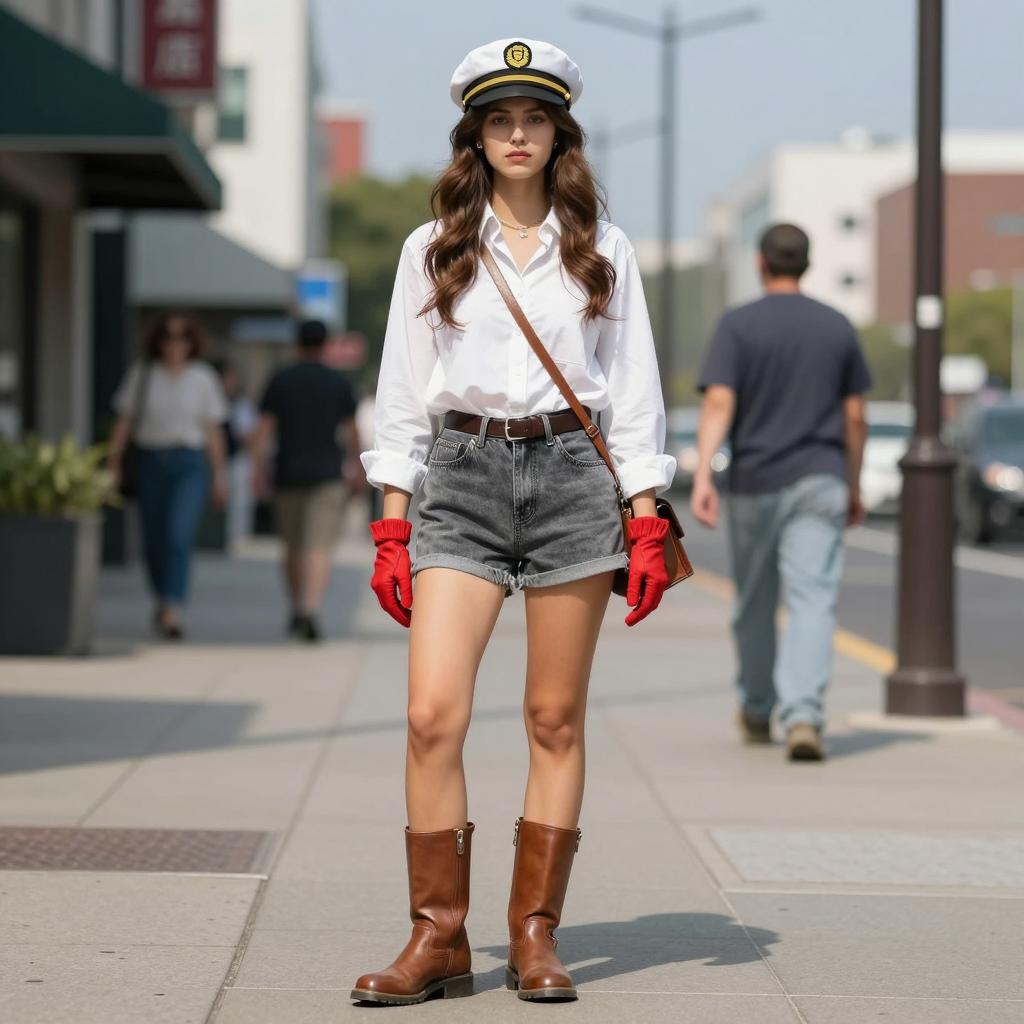 Captain obvious costume, photorealistic, young woman standing on sunlit sidewalk, wearing white button-up shirt, grey denim shorts, brown leather boots, red gloves, brown crossbody bag, captain's hat, brown belt, long wavy brown hair, serious expression, clear blue sky, blurred people in background, daytime, casual street style, urban setting, natural light, detailed ures