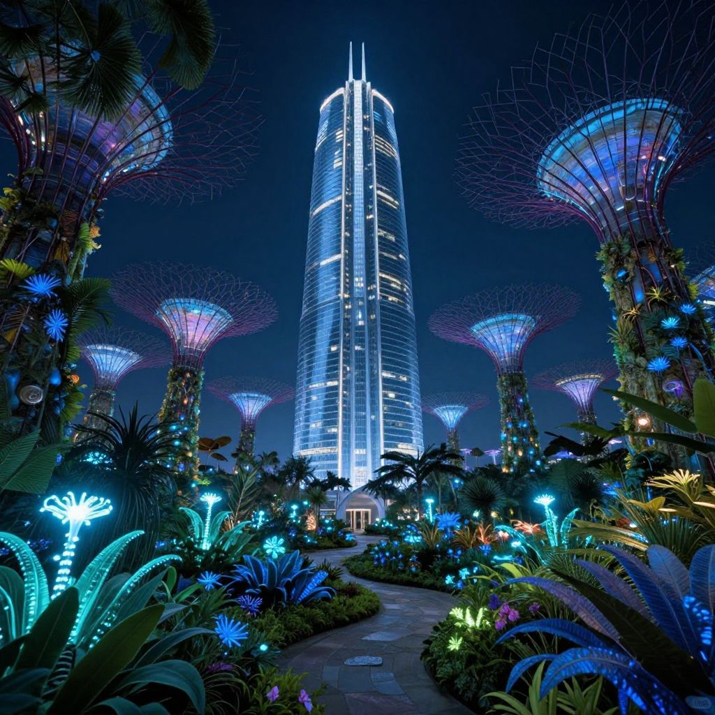 A vivid, digital CGI image of a futuristic cityscape at night. A tall, illuminated skyscraper with glowing blue and white lights stands centrally, surrounded by bioluminescent, dome-shaped plants with vibrant blue, pink, and purple lights. The ground is a winding path lined with glowing, neon-blue and green foliage. The sky is dark blue, enhancing the bright, colorful lights. The scene combines elements of science fiction and futuristic architecture, with a lush, otherworldly garden atmosphere.