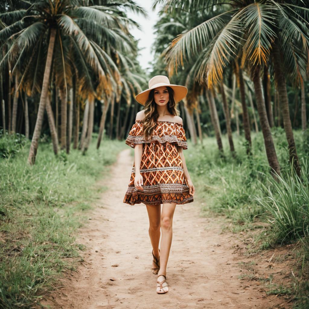 Holiday armadillo fancy, photograph of a young woman standing on a dirt path, fantasy costume, bird-like headband with brown and pink feathers, sleeveless dress with striped gold and brown pattern, pink and brown ruffled skirt, large fan-like accessory with brown and orange segmented blades on her back, one leg covered in striped black and brown pattern, black high-heeled sandals, green forest background, tall trees, earthen wall to the right, soft natural light, slightly smiling, casual pose, realistic style, everyday setting, fantasy elements, whimsical, detailed costume, summer outfit