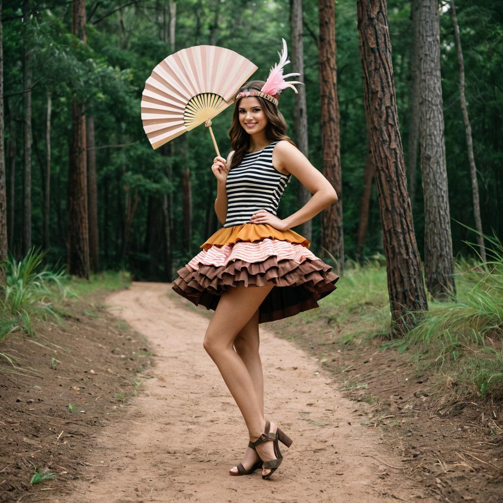 Photograph of a young woman standing on a dirt path in a green forest background. She wears a sleeveless black and white striped top paired with a ruffled skirt in shades of brown, orange, and pink. The costume includes a bird-like headband with pink and brown feathers and a large pink folding fan. She stands casually, smiling slightly, wearing brown high-heeled sandals. The scene is lit with soft natural light.