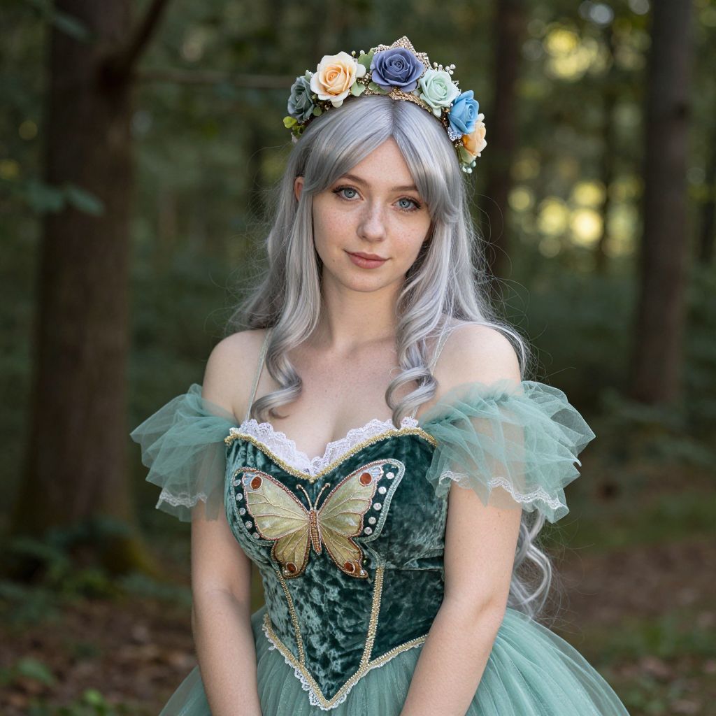 A whimsical bridesmaid bachelorette in a fairy-tale inspired costume — a velvet green gown with tulle sleeves and a butterfly motif, paired with a crown made of roses and lace — posing in a forest clearing with dappled sunlight, the woman has long silver hair, gentle blue eyes, and a soft, joyful expression.. The woman has big tits and cute face