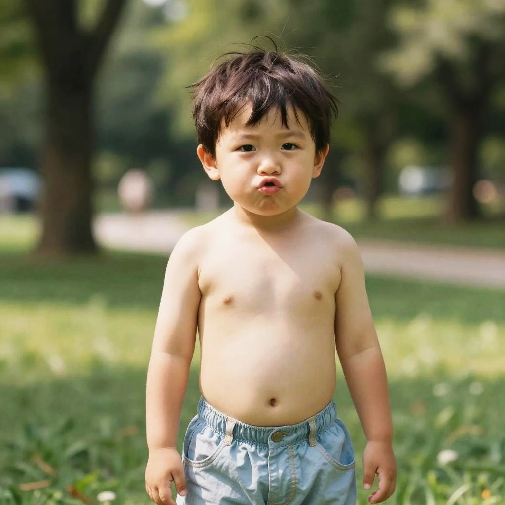 Photograph of a cute, shirtless Asian toddler with short black hair, wearing light blue pants, standing in a sunlit, green park.