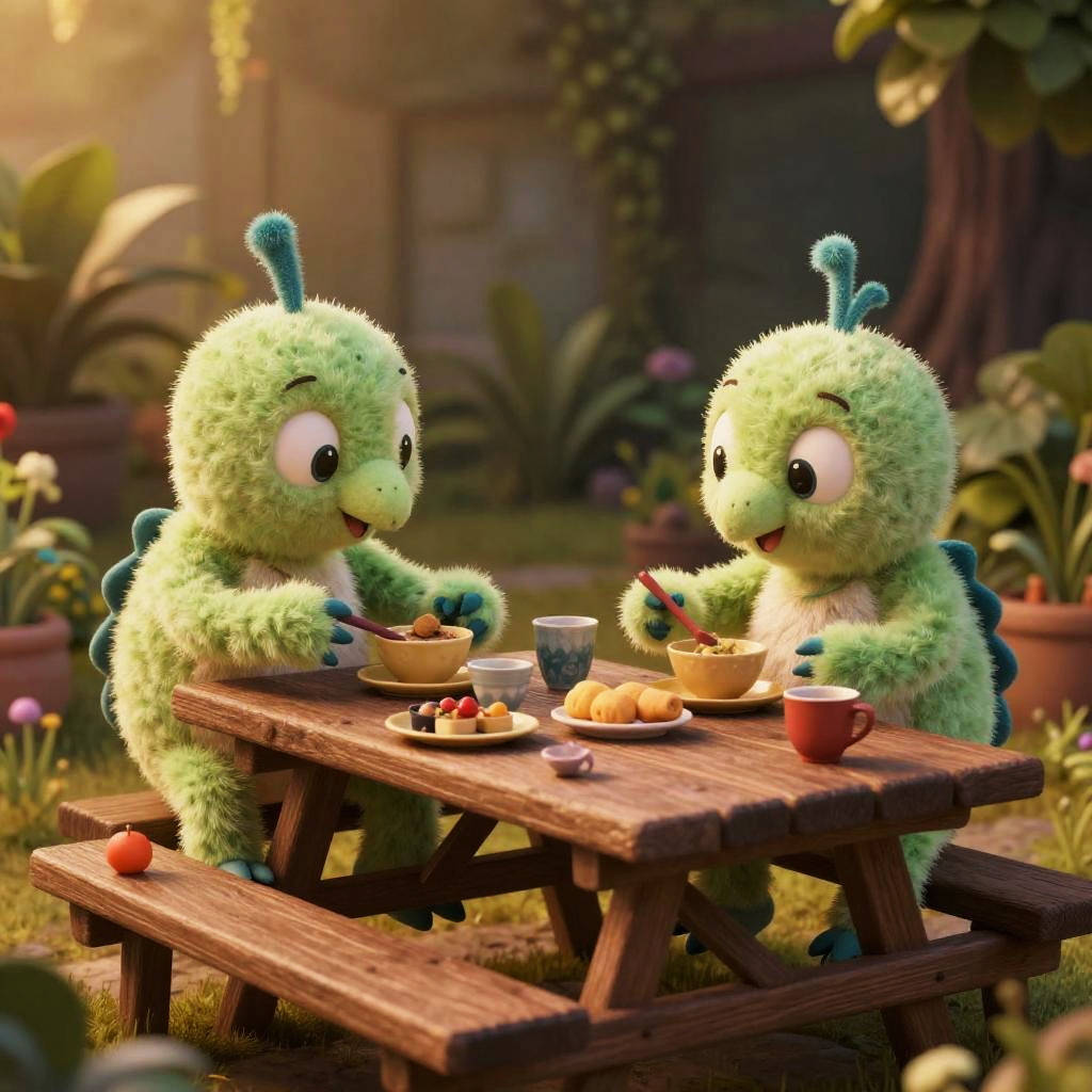 Liliputienses engaged in playful activities on a picnic table where everyday objects appear gigantic, showcasing their tiny scale, warm lighting, cozy and intimate scene, surrounded by abundant flora, highly detailed fantasy art, soft color palette