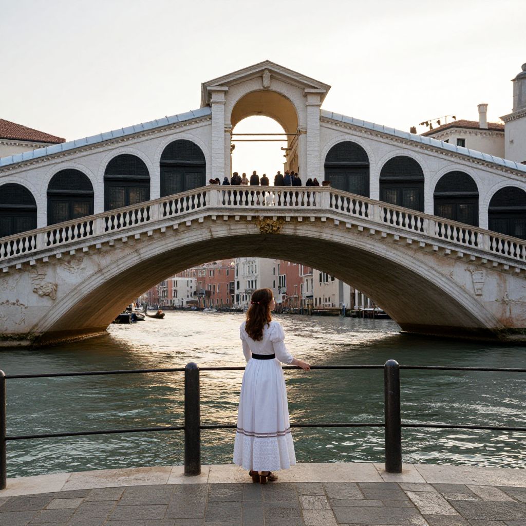 A wide-angle photograph of the Rialto Bridge in Venice, Italy, at golden hour, with the sparkling canal waters reflecting the soft sunset glow, showing the arches and stone balustrades of the bridge, a local Venetian woman in a traditional white dress stands near the center with a hand on a railing, looking toward the city skyline.