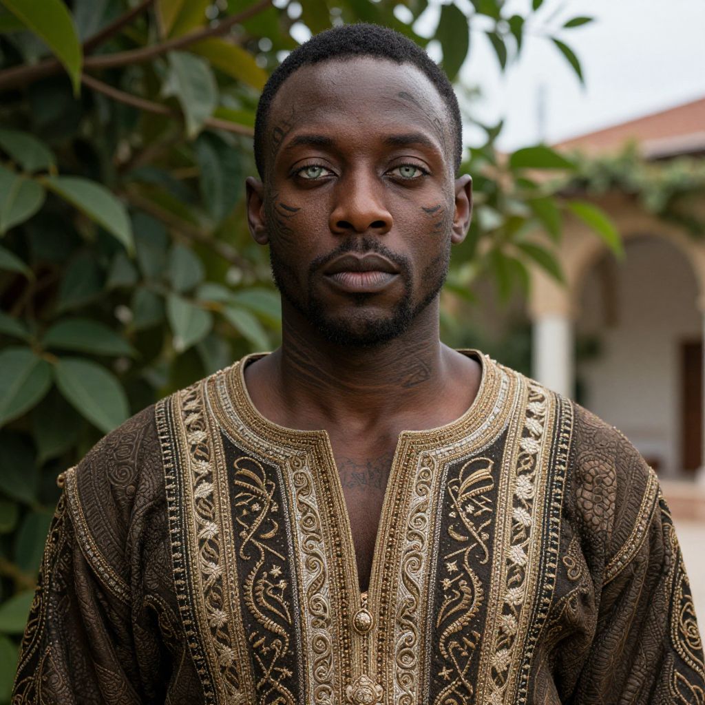 Photograph of a serious-looking, dark-skinned African man with short black hair and a trimmed beard. He wears an intricately embroidered, dark brown and gold traditional shirt with a V-neck. His green eyes stand out against his dark complexion. The background features green leafy bushes and a blurred, arched building with a red-tiled roof. The lighting highlights the textures of his shirt and his smooth skin. The image has a natural, outdoor setting with a focus on cultural attire and facial expression.