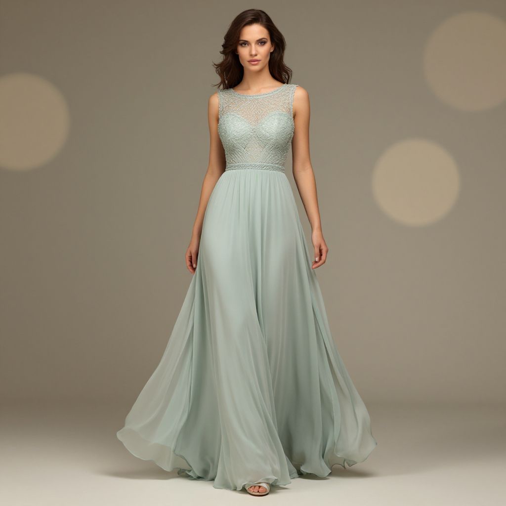 "Woman, romantic elegant, sleeveless gown in soft sage green, intricate lace bodice with beadwork, round neckline, flowing chiffon skirt, empire waist, floor-length, sheer overlay, pale silver peep-toe heels, photo studio with bokeh lighting effect.. Sexy. Pretty face and beаutiful eyes. Big breasts."