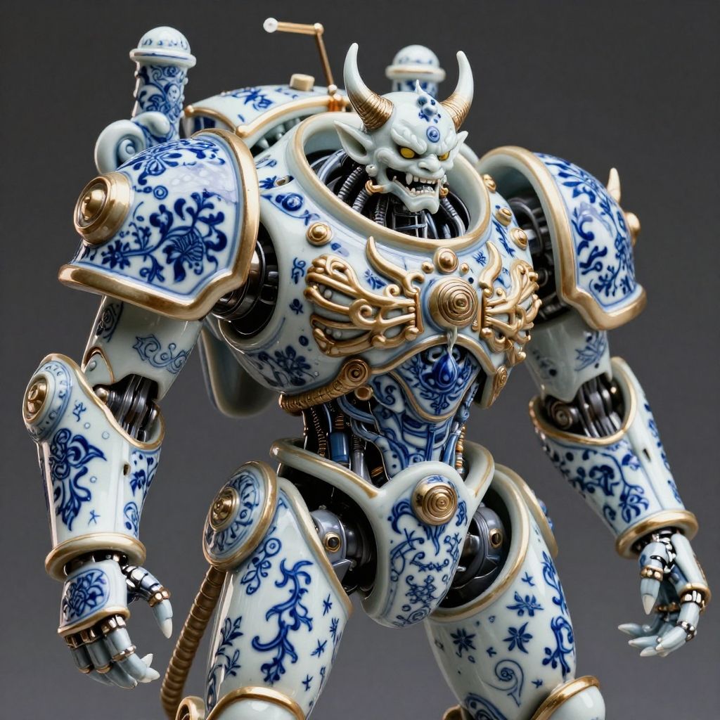Photorealistic CGI of a towering robot with a muscular build, adorned in intricate blue and white porcelain armor decorated with floral patterns. The robot has a horned helmet, golden accents, and a detailed golden chest plate with ornate designs. Its limbs are robotic, with visible joints and mechanical parts. The background is a gradient of dark gray, highlighting the robot's elaborate and colorful design. The robot's pose is dynamic, with one arm slightly forward and a weapon-like appendage on the right side. The image has a high-detail, glossy texture, emphasizing the craftsmanship of the armor.