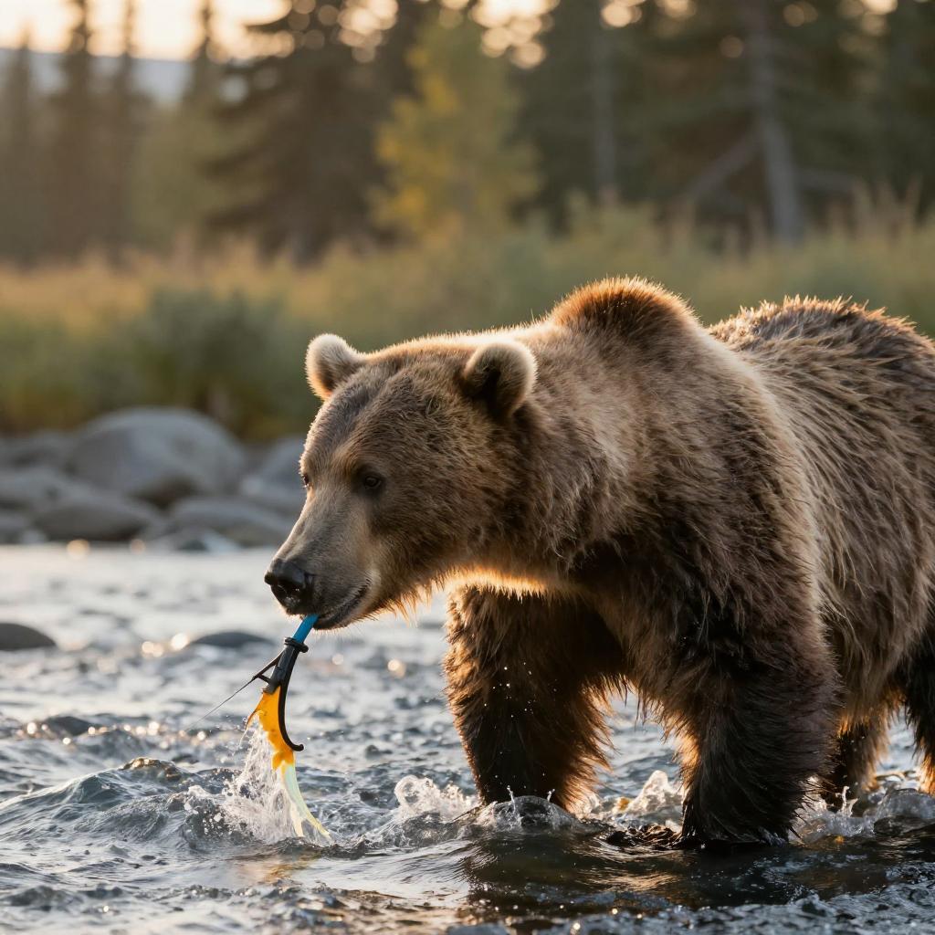RAW Photo, DSLR close-up, male grizzly bear fishing, in salmon river in Alaska, at golden hour, chilly nature documentary film style, sunrays filtering through, cinematic lighting, professional color-graded.