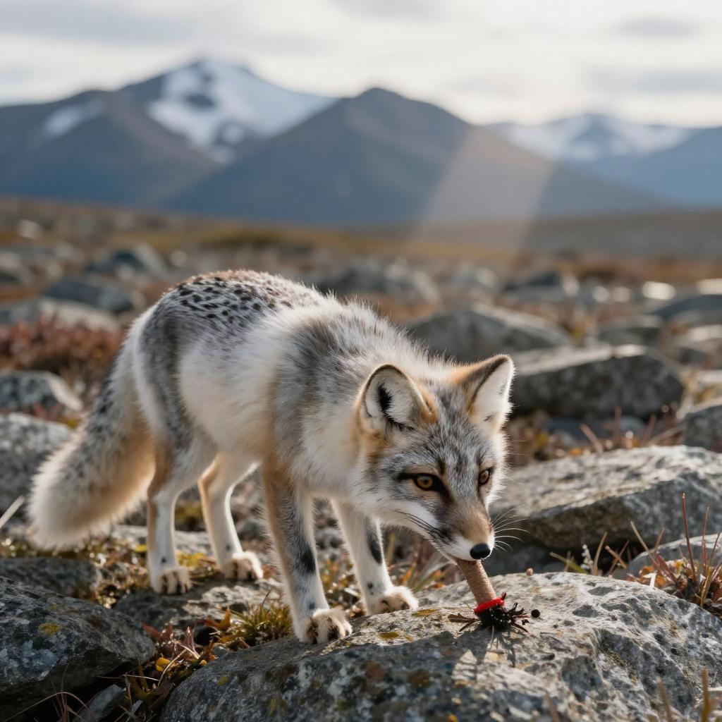 Close-up image of a male grizzly bear standing in a shallow salmon river in Alaska during golden hour. The bear is holding a freshly caught green salmon in its mouth. The background features pine trees and snow-capped mountains with sunrays filtering through, creating cinematic lighting.