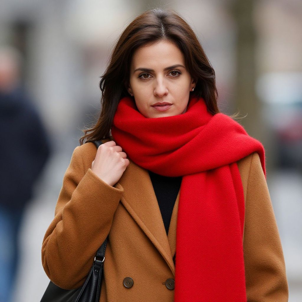 Photograph of a woman with fair skin and dark brown hair, wearing a tan, double-breasted coat and a vibrant red scarf that is wrapped loosely around her neck. She has a serious expression and is holding the scarf with her right hand. Her coat is slightly open, revealing a black top underneath. She carries a black handbag on her left shoulder. The background is blurred, featuring indistinct figures and a gray, urban street scene with hints of trees and buildings. The overall color contrast between her red scarf and tan coat draws attention to her face.
