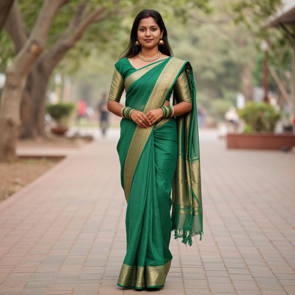 Photograph of an Indian woman in a green saree with gold border, standing on a tree-lined brick path, adorned with jewelry, smiling confidently.
