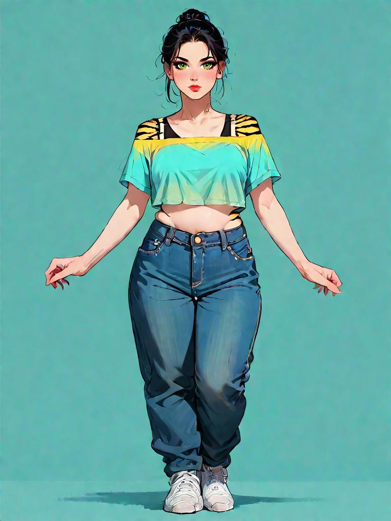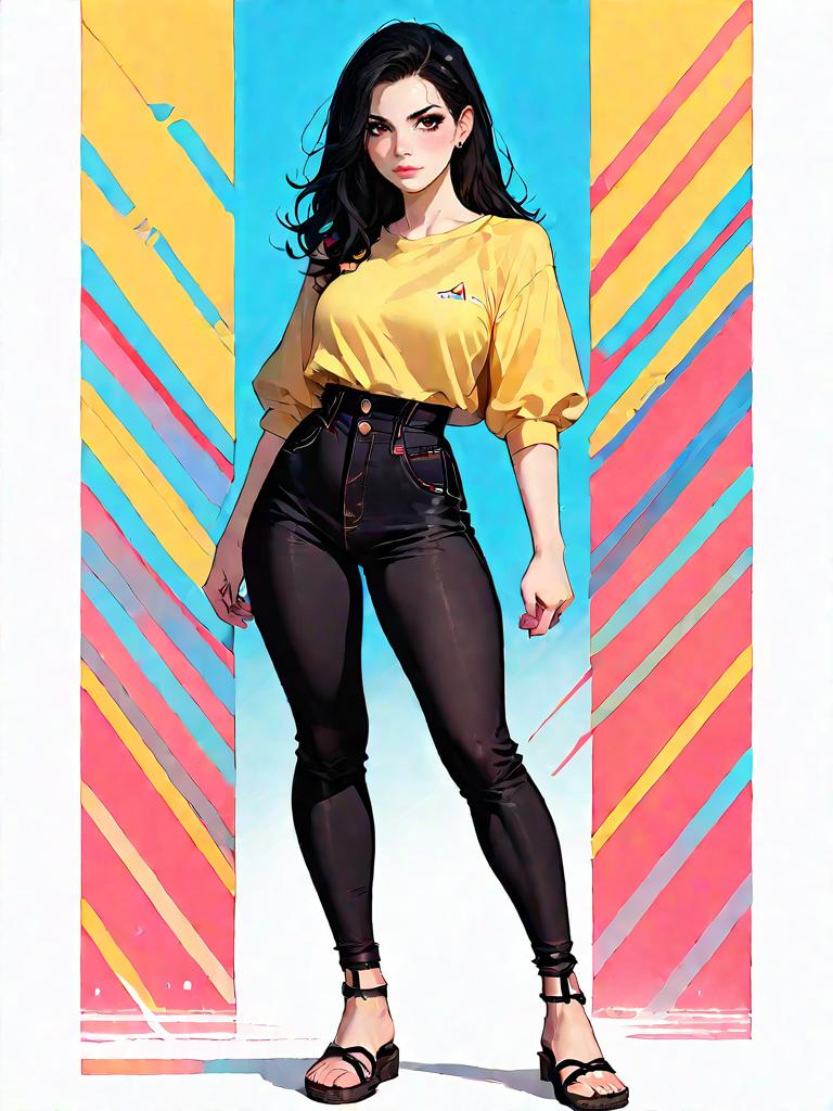 1girl, source_comics, realistic face, full body shot, Woman, casual chic, mustard yellow cropped top with a twisted front detail, long sleeves, round neckline, paired with high-waisted skinny white jeans, minimal jewelry with stud earrings, slick high ponytail, photo studio background.
