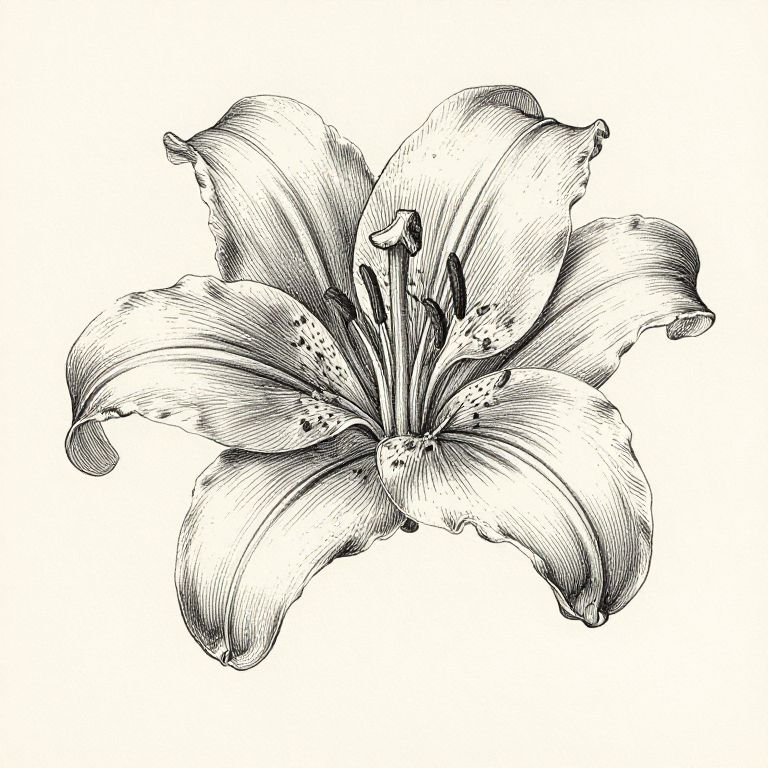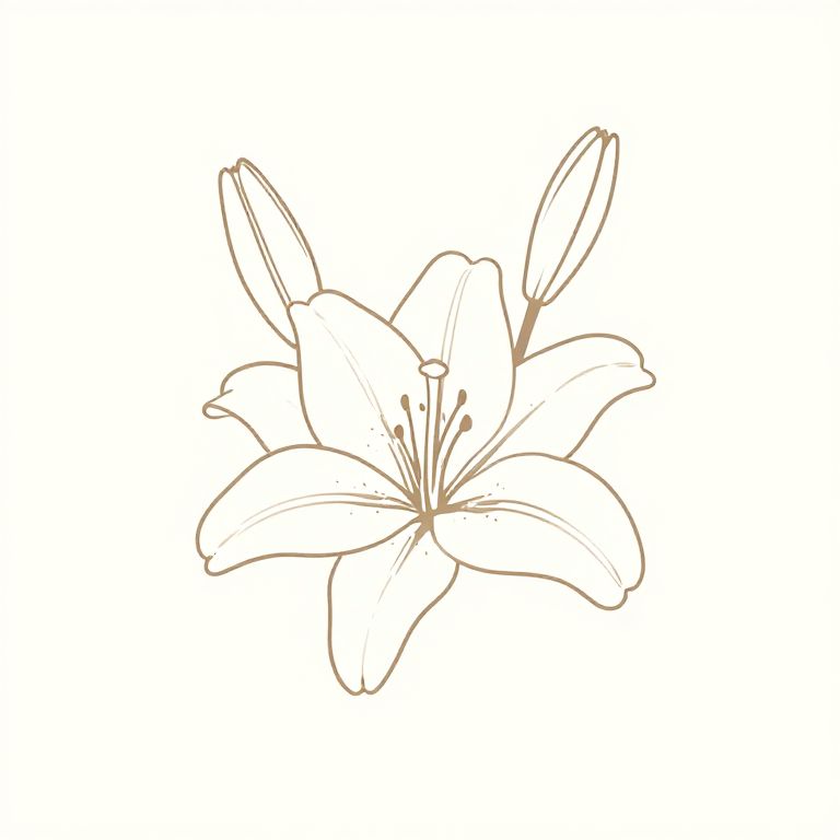 Lily line drawing, modern minimalistic floral line art with smooth continuous lines, focusing on the gentle shape of the lily flower and buds, balanced composition with negative space, ideal for wall art or contemporary graphic design.