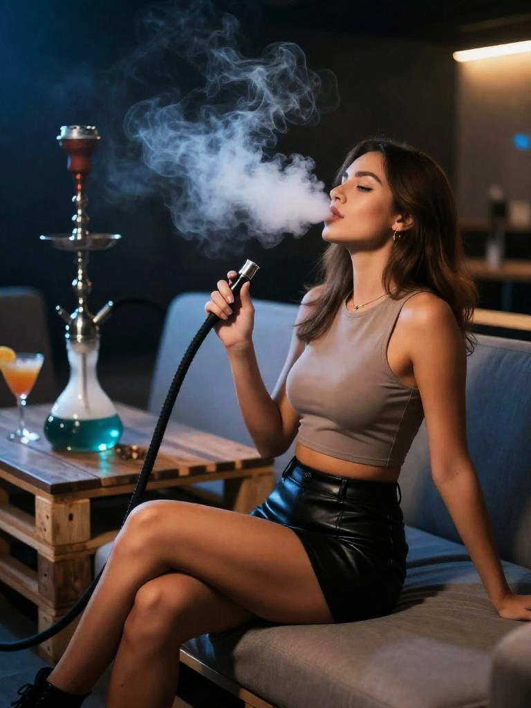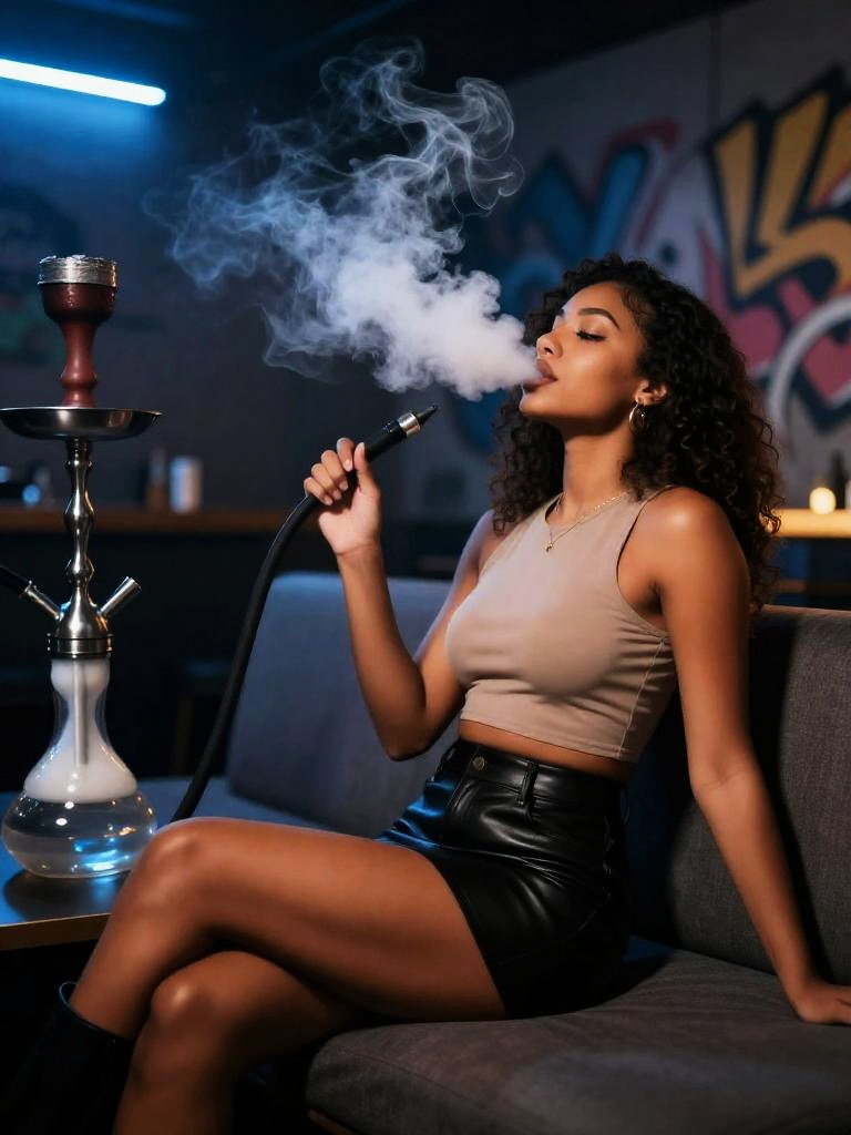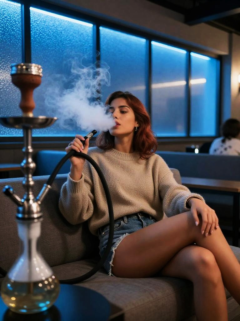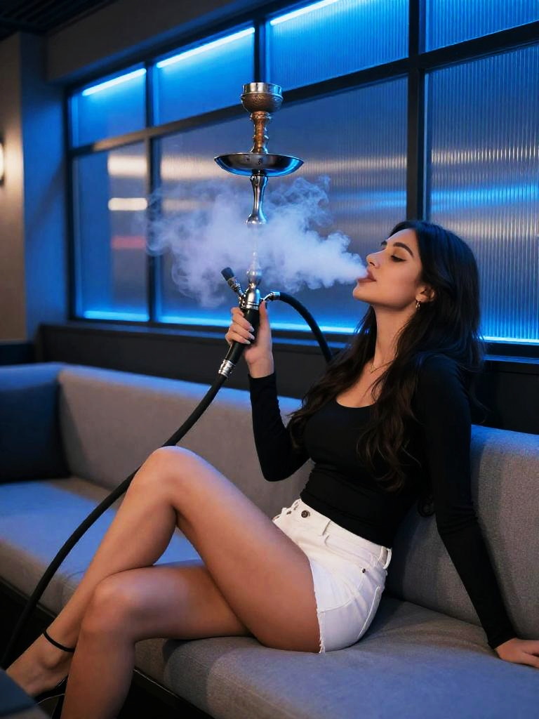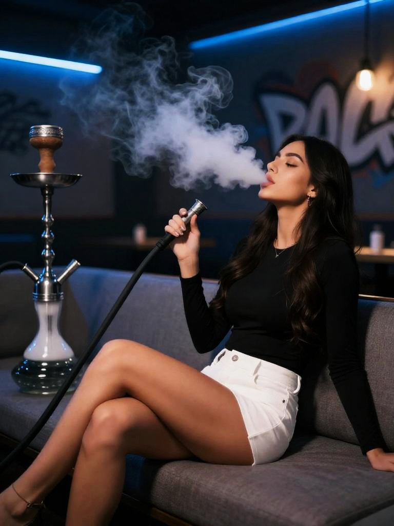 Fair-skinned woman with chestnut hair reclining on a sofa in a modern hookah bar. She is wearing a black long-sleeve top and white shorts, holding a shisha hose and exhaling smoke. The indoor lounge features dim lighting, blue ambient lights, and graffiti-style walls, creating a cozy atmosphere.