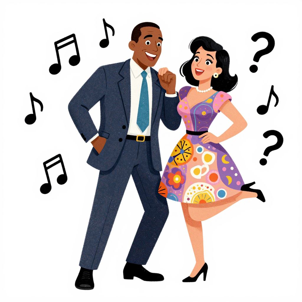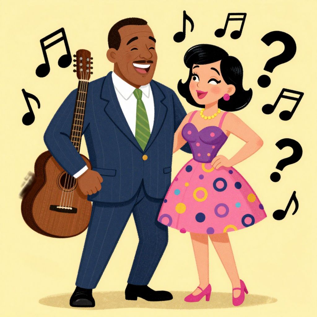 Cartoon of a smiling Black man in a suit with a guitar, and a smiling white woman in a polka dot dress, both standing and singing