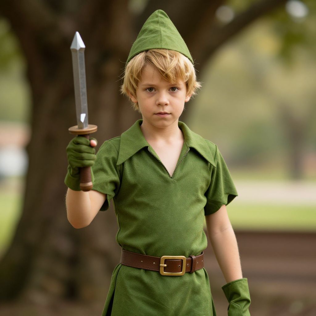 Photograph of a young blonde boy in a green elf costume holding a small sword, standing outdoors with a blurred tree background.