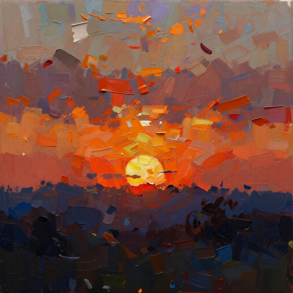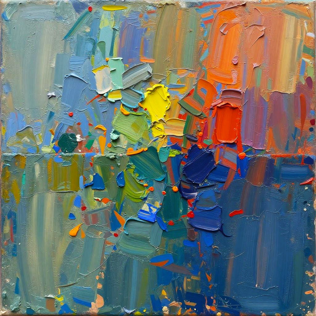 Impasto brush strokes capturing a lively floral still life, thick layered paint, bright warm tones, textured petals and leaves, impressionistic style, vivid and detailed