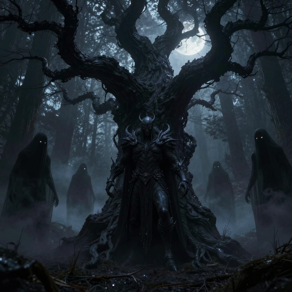 Morgoroth, standing beneath a twisted black tree in a haunted forest, surrounded by ghostly wraiths and glowing eyes watching from the shadows, eerie atmosphere with mist and cold moonlight filtering through gnarled branches, high fantasy dark lord concept art.