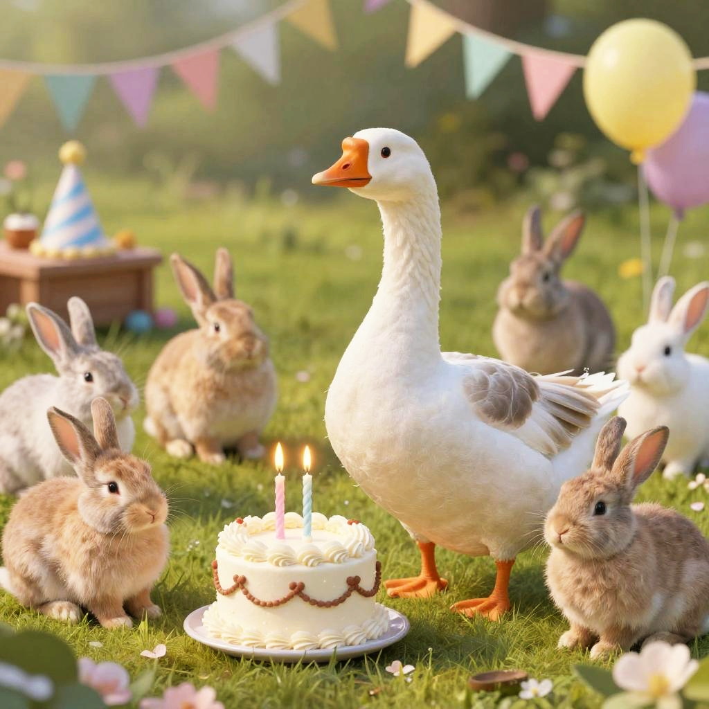 A goose is having a birthday party and is surrounded by rabbits in a whimsical atmosphere