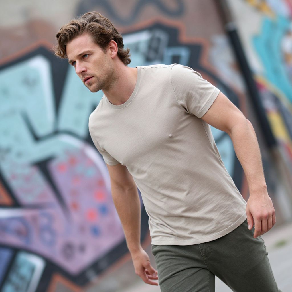 Modern Mullet, fit european man, candid street shot, dynamic angle, graffiti backdrop, athletic build, neutral colored clothing, relaxed yet stylish, natural hair texture, modern grooming, high resolution