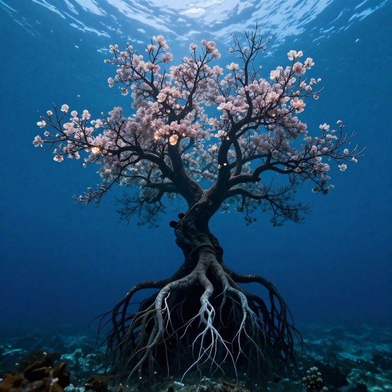 A majestic, inverted tree emerges from the ocean floor, its roots sprawling upward like branches, adorned with ethereal, glowing blossoms that illuminate the deep blue waters below.